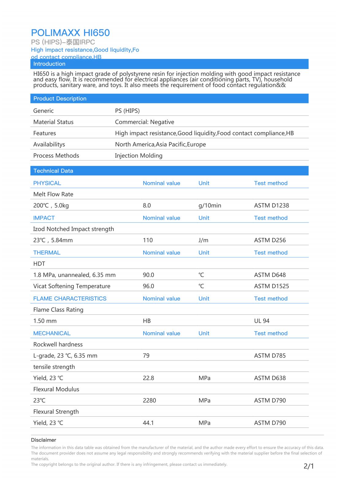 Introduction HI650 is a high impact grade of polystyrene resin for injection molding with good impact resistance and easy flow. It is recommended for electrical appliances (air conditioning parts,TV), household products, sanitary ware, and toys. It also meets the requirement of food contact regulation